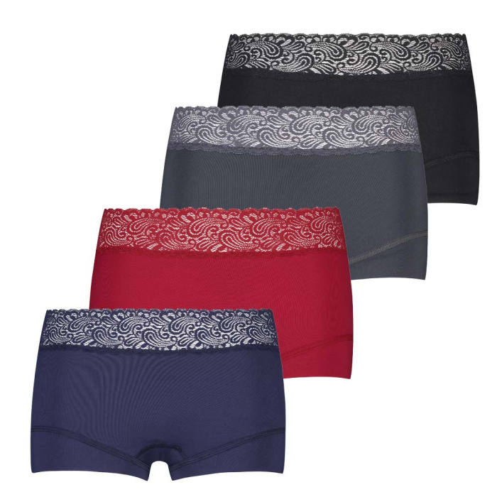 Ontdek onze luxe 4-pack dames shorts met kant, speciaal ontworpen voor en door vrouwen. Gemaakt van zacht microÂvezel (90% polyamide, 10% elastaan) voor optimaal comfort en elegantie. Verkrijgbaar in chic donkerblauw, warm donkerrood, stijlvol grijs en klassiek zwart.